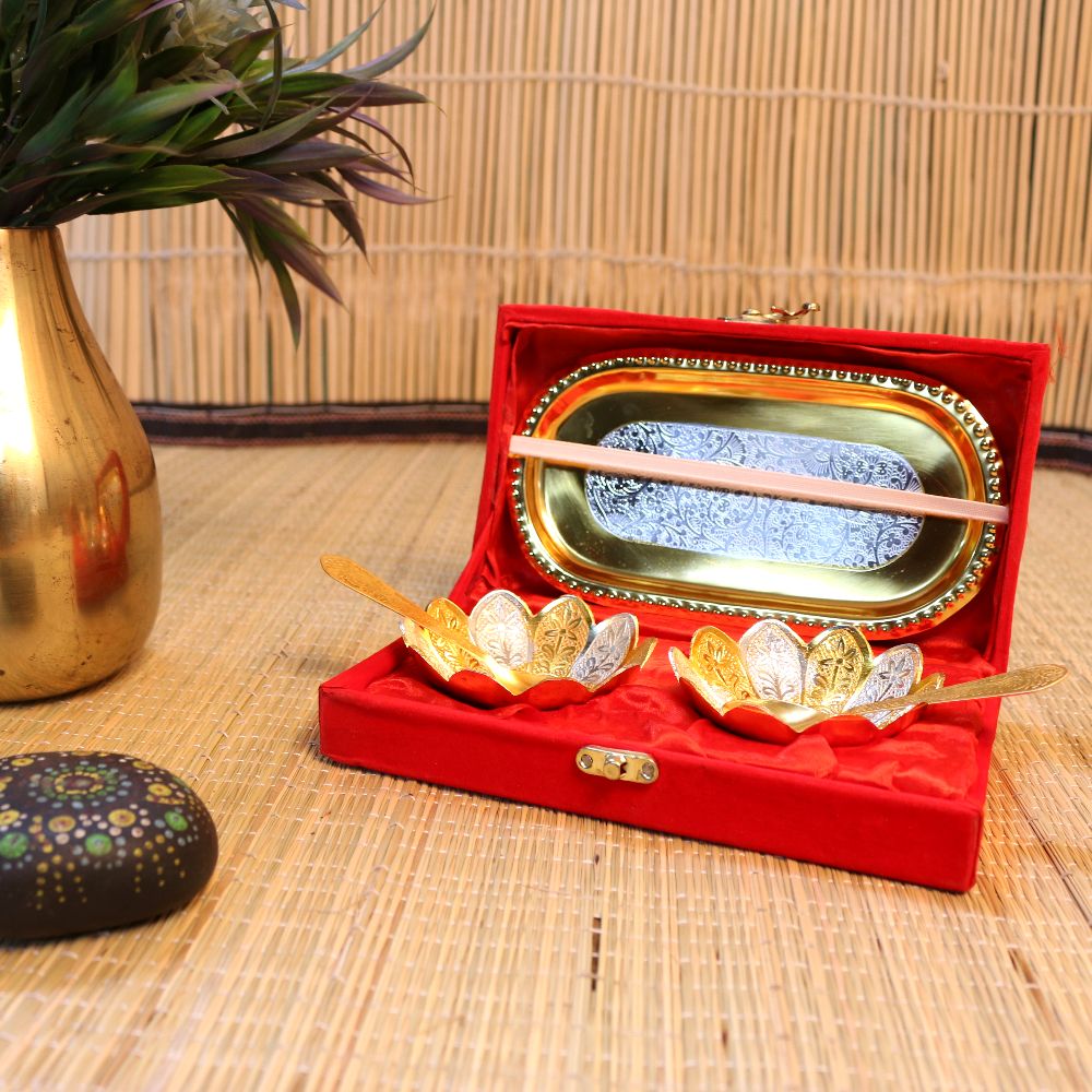 This German Silver golden-plated tray and bowl set blends traditional charm with luxurious craftsmanship — beautifully presented in a premium gift box, perfect for any special occasion.